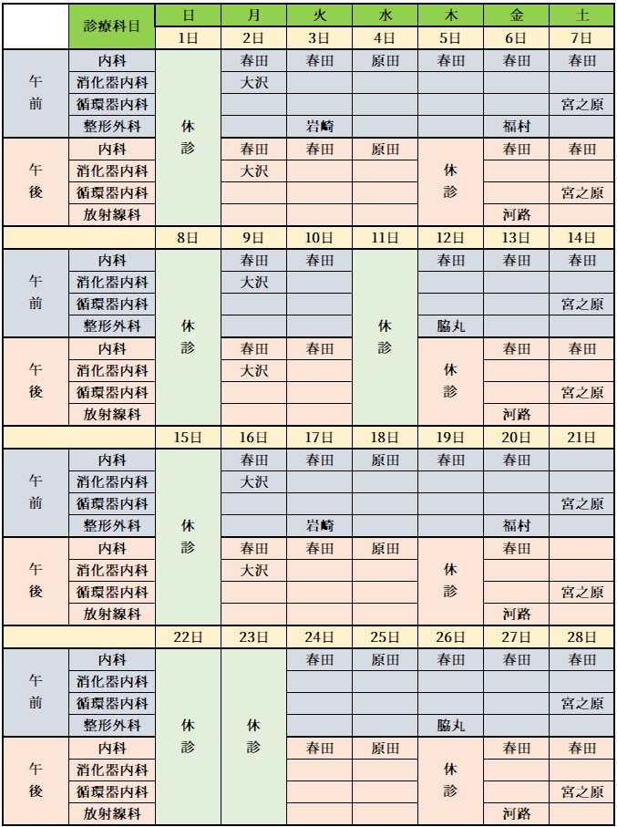 ※下表は上表から整形外科のみ抜き出したスケジュールです。午前中のみです。